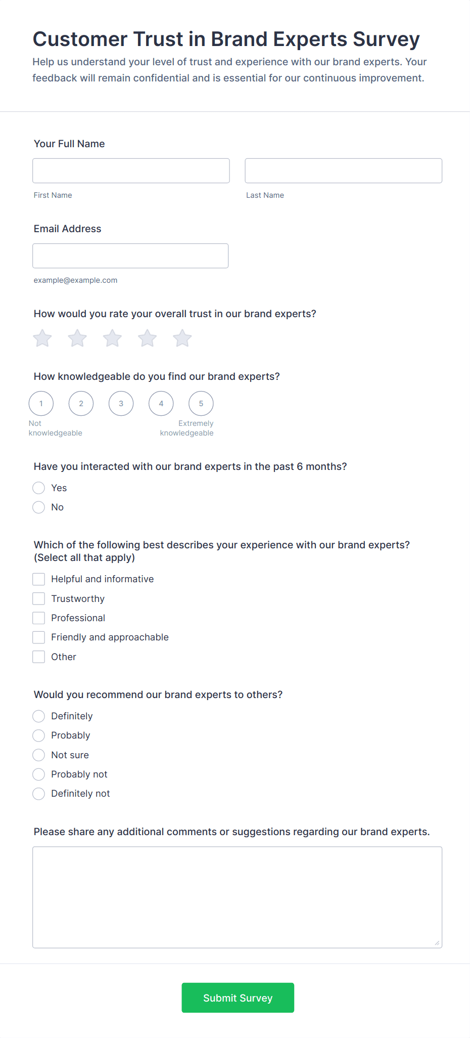 For employee surveys, consider adding anonymity options; for customer surveys, include contact fields if follow-up is needed.