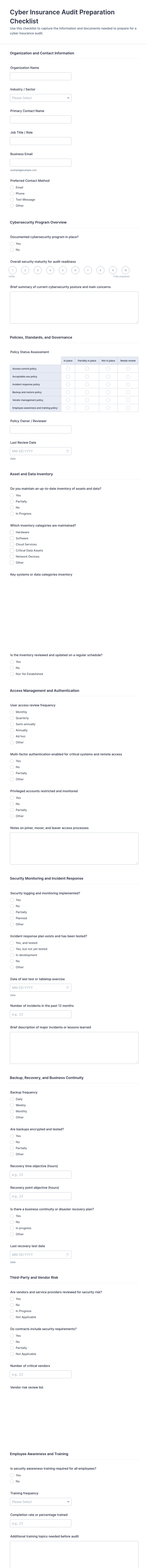 - Multiple choice or checkbox fields for compliance checks.