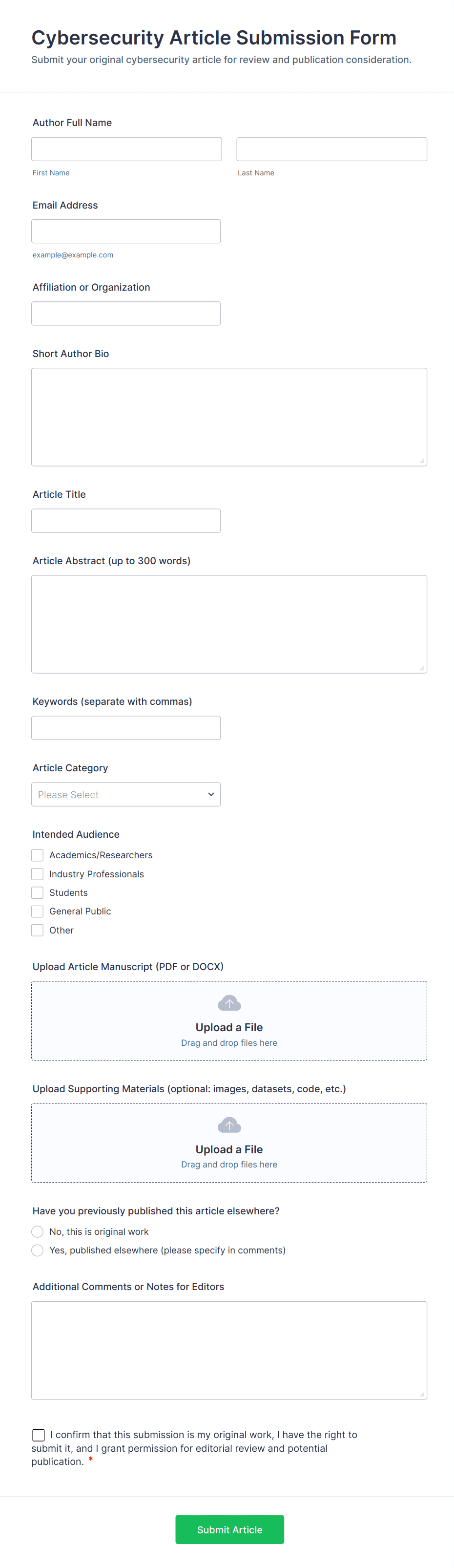 • Editorial submission forms may require fields for author bio, article title, and file uploads