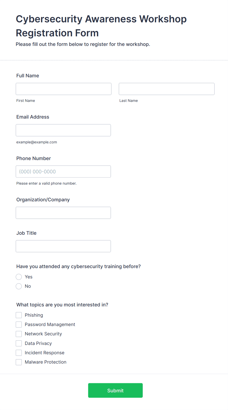 • Workshops and training sessions: Register participants, gather skill levels, and manage waitlists.