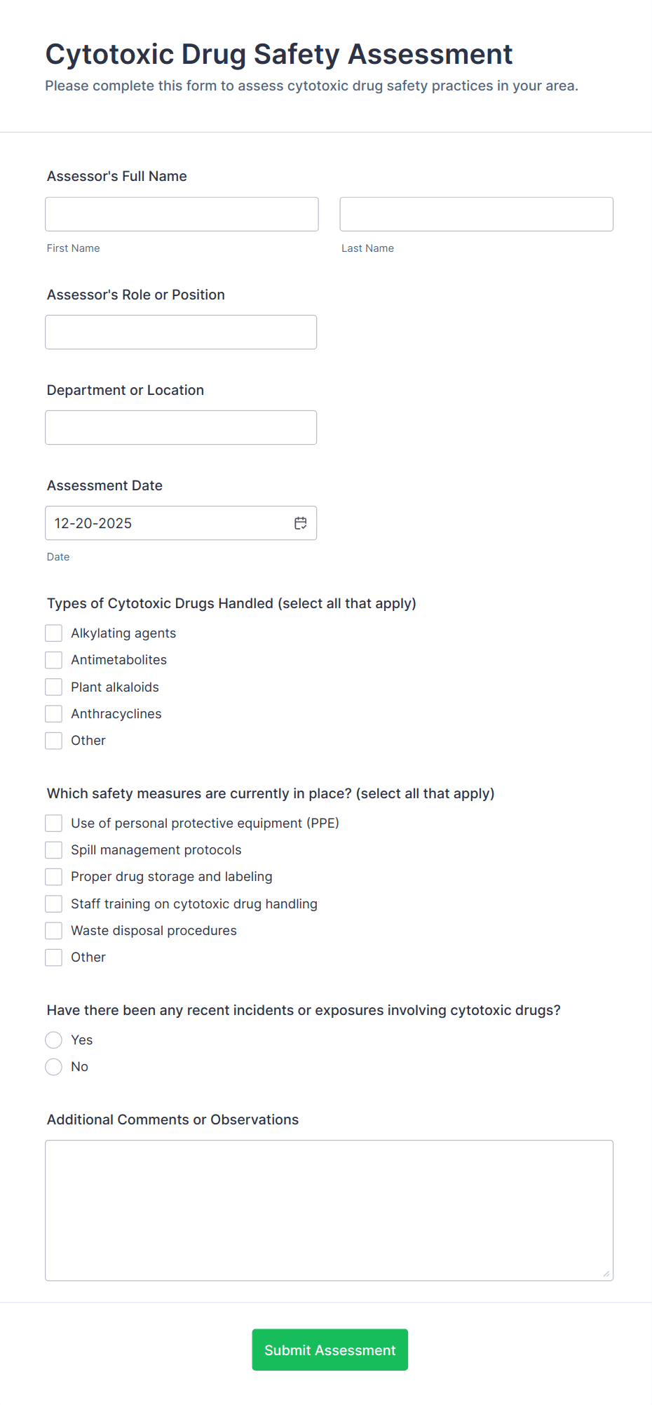 Shingles Vaccination Assessment Form helps clinics, pharmacies, and healthcare providers pre-screen adult patients for shingles vaccines, capturing health history, allergies, and consent in one secure online form.
