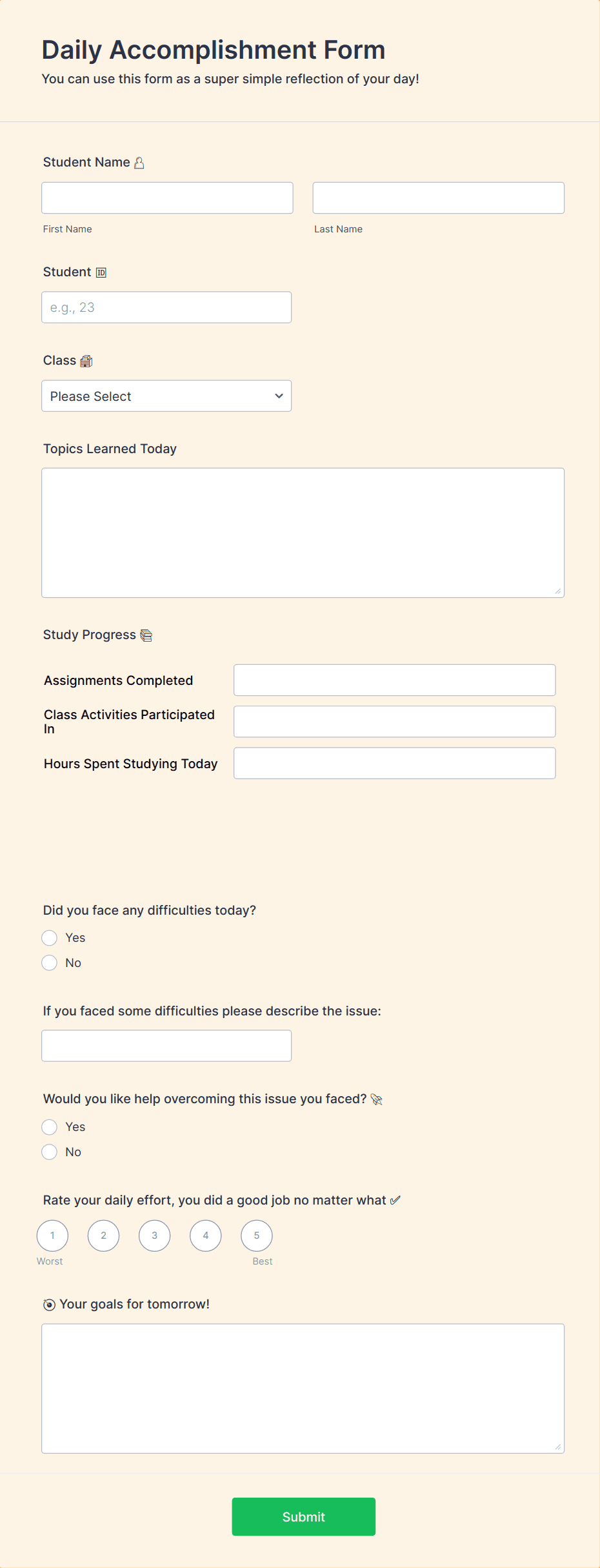 To use Daily Accomplishment Form, you'd need to clone the template to your Jotform account, customize it to suit your needs, and then share the link or embed the form on your preferred platform for use.