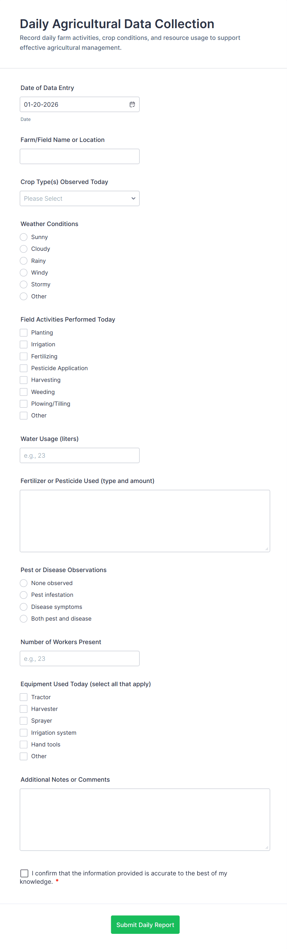 Collect and manage information for your farm with free online Farmer Forms. Whether you’re filling out land lease agreements, selling your products, or collecting worker applications, choose a template below and customize it to perfectly match your needs with our drag-and-drop builder. No coding required! You can then embed your form in your website, share it with a link, or fill it out yourself directly from your smartphone, tablet, or computer. Stop tracking information with pen and paper and upgrade to online Farmer Forms that work great on any device.