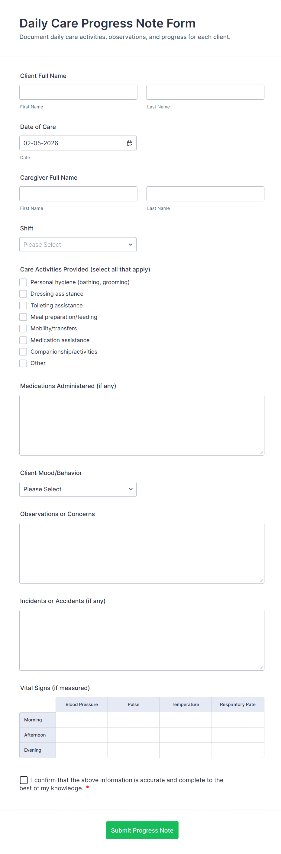 Caregiver forms are online forms used to collect information regarding childcare services, like parent contact information, childrens’ medical history and prescriptions, waivers, caregiver job applications, and more. Need to collect information, payments, or e-signatures for your childcare services? Choose a ready-made Caregiver Form template to do it instantly on any device.