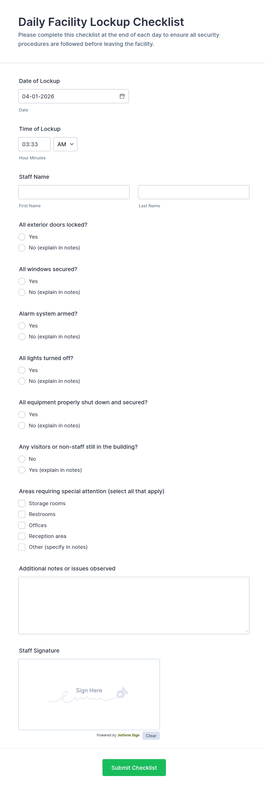 Track end-of-day procedures with the Daily Closing Checklist Form, helping managers and staff confirm closing tasks, reduce missed steps, and keep consistent records across shifts and locations with Jotform.