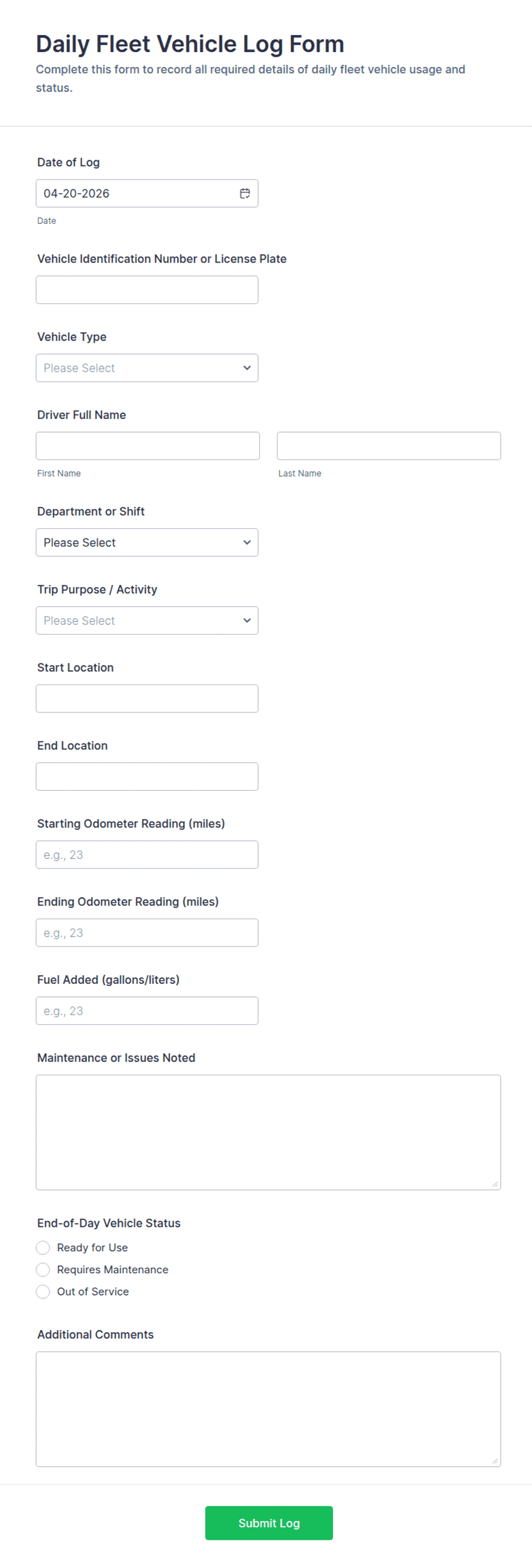 Add inspection checklists, maintenance issue fields, fuel and mileage inputs, or incident details based on what you need. Keep fields consistent so reporting can be compared across vehicles.