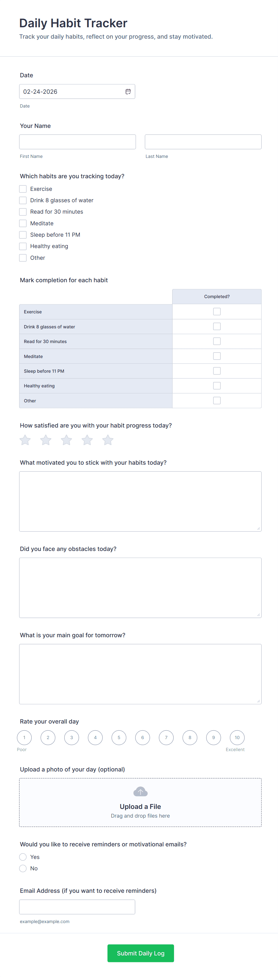 Habit Tracking Forms are digital tools designed to help individuals and organizations monitor, record, and analyze daily routines, behaviors, or lifestyle changes. These forms are commonly used to track habits such as exercise, hydration, reading, medication adherence, sleep patterns, or any other activity that someone wants to develop or maintain over time. By providing a structured way to log progress, Habit Tracking Forms support users in building consistency, identifying patterns, and achieving personal or group goals. They are valuable for personal development, wellness programs, educational settings, coaching, and even workplace productivity initiatives.
