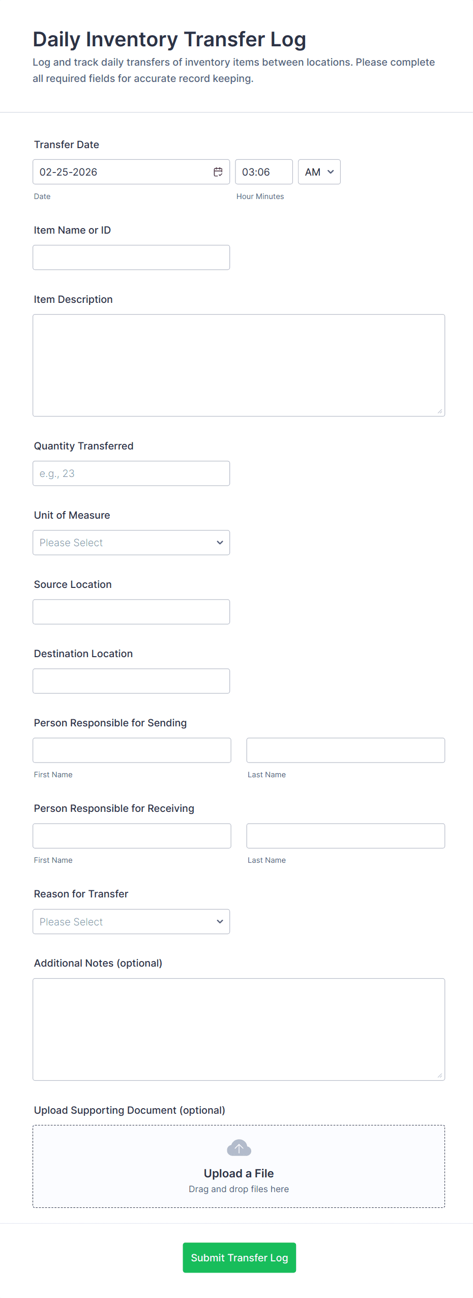 - Inventory Tracking: Forms may include fields for item name, SKU, quantity, location, and restock dates.