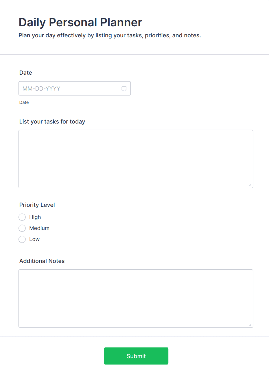 Personal forms are versatile digital tools designed for individual use, helping people collect, organize, and manage personal information for a wide range of everyday needs. Whether you’re tracking fitness goals, planning events, managing household inventories, or gathering feedback from friends and family, personal forms streamline the process of data collection and organization. Common use cases include contact forms, personal budget trackers, travel itineraries, health and wellness logs, RSVP forms, and even hobby or project trackers. These forms are ideal for anyone looking to simplify their daily routines, keep records, or facilitate communication in their personal life.