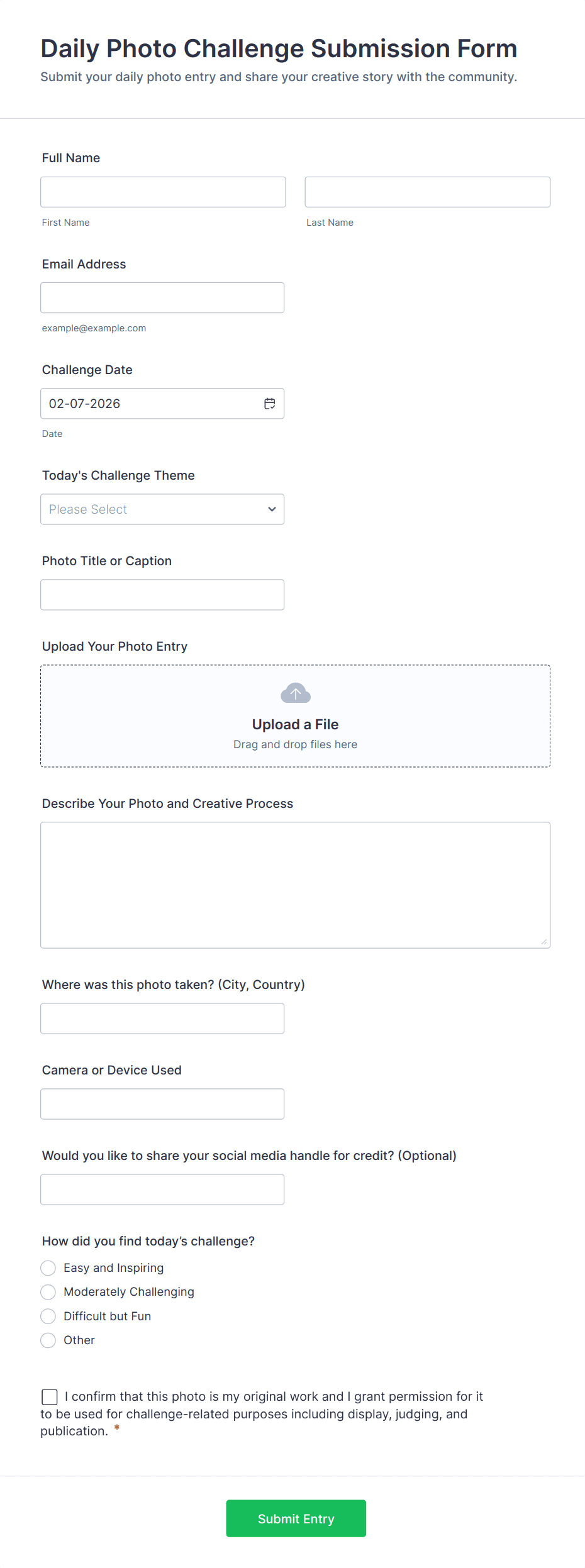 Contest entry forms are specialized online forms designed to collect participant information for a wide range of competitions, giveaways, and sweepstakes. These forms streamline the process of gathering essential details such as names, contact information, eligibility confirmations, and contest-specific responses like creative submissions or answers to quiz questions. Whether you’re running a photo contest, a writing competition, a social media giveaway, or a corporate challenge, contest entry forms help organizers efficiently manage entries, ensure compliance with rules, and maintain a fair and organized selection process.