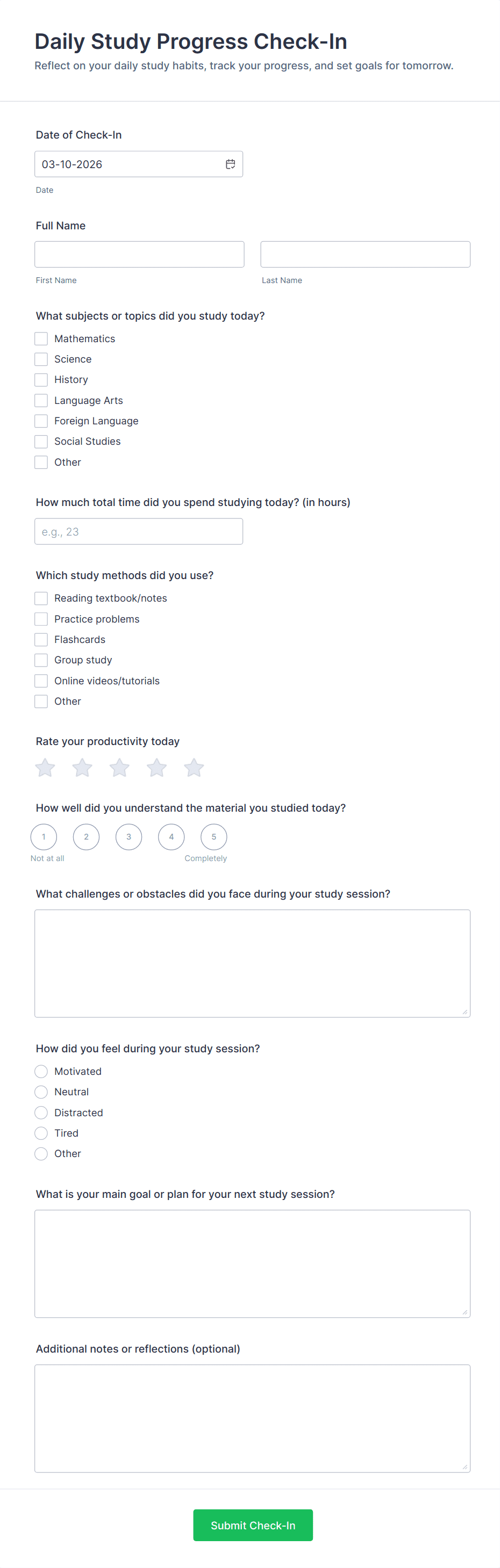 Habit Tracking Forms are digital tools designed to help individuals and organizations monitor, record, and analyze daily routines, behaviors, or lifestyle changes. These forms are commonly used to track habits such as exercise, hydration, reading, medication adherence, sleep patterns, or any other activity that someone wants to develop or maintain over time. By providing a structured way to log progress, Habit Tracking Forms support users in building consistency, identifying patterns, and achieving personal or group goals. They are valuable for personal development, wellness programs, educational settings, coaching, and even workplace productivity initiatives.