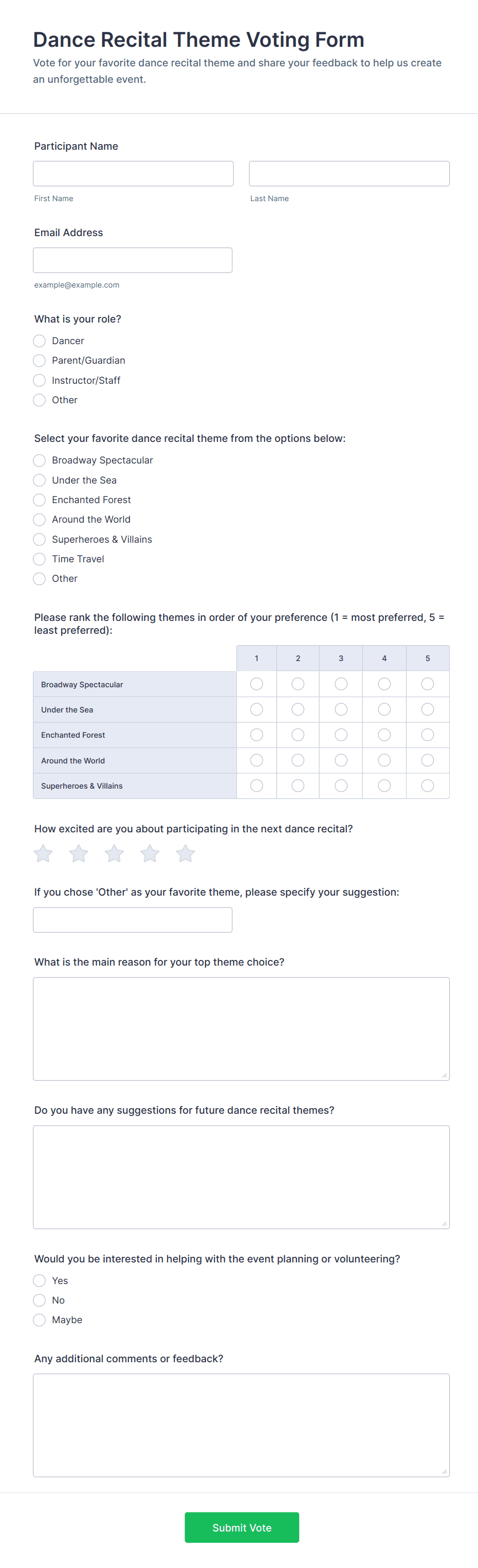 Voting forms are used by schools, businesses, clubs, nonprofits, event organizers, and any group needing to make collective decisions or gather opinions.