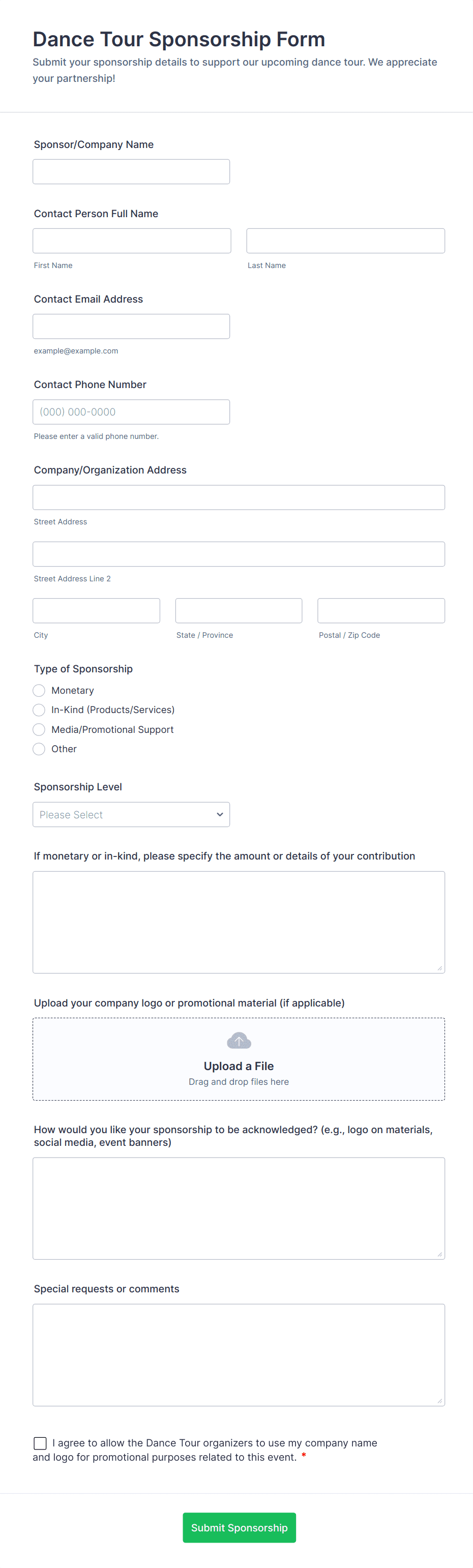 A sponsorship form is a document or online form used to collect information and commitments from individuals or organizations willing to support an event, project, or cause financially or through in-kind contributions.