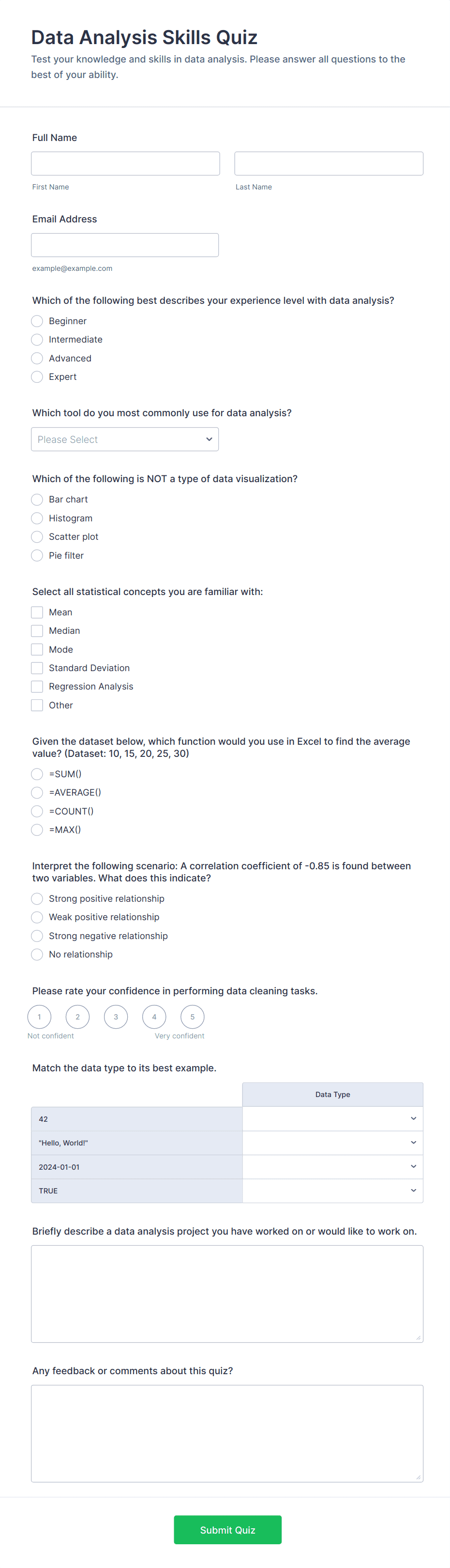 Quiz Templates are pre-designed forms specifically created to facilitate the process of building quizzes for a variety of purposes, such as education, employee training, lead generation, event engagement, and more. These templates provide a structured way to present questions, collect answers, and automatically score or evaluate responses. Whether you’re a teacher assessing student knowledge, a business running a product knowledge test, or a marketer creating a fun personality quiz, Quiz Templates offer a flexible foundation to suit your needs. They can be used for online exams, trivia games, onboarding assessments, customer feedback quizzes, and interactive learning modules.