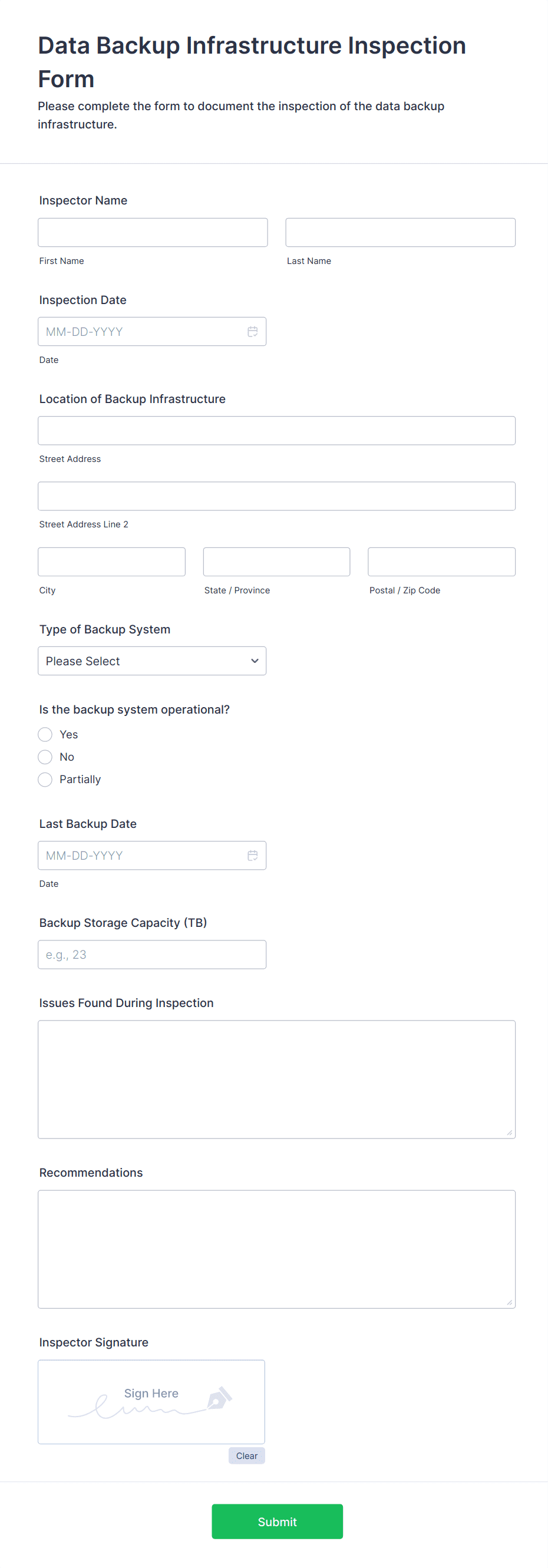 Yes, modern inspection forms—especially digital ones—can include file upload fields for photos and signature fields for verification and accountability.
