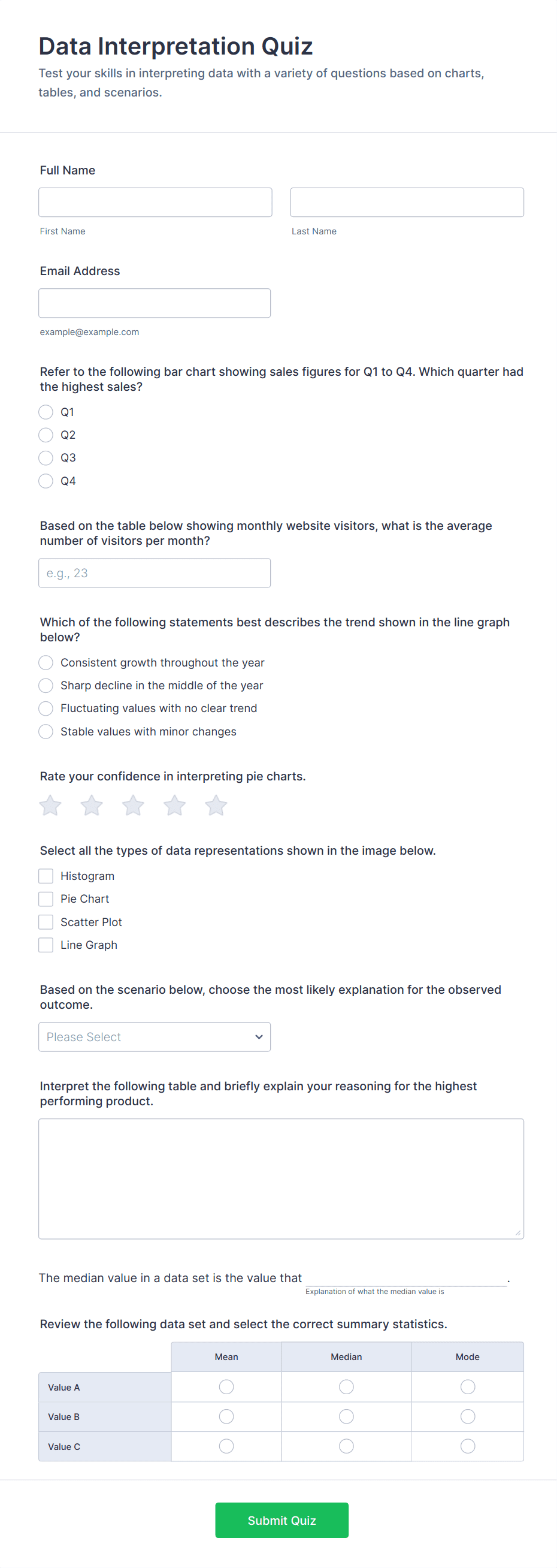 • For educational or compliance quizzes, include a mix of question types and set correct answers for automatic scoring.