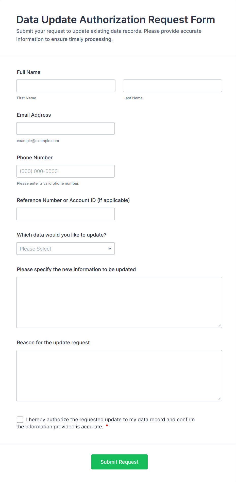 An authorization form is a document used to obtain formal consent or permission from an individual or organization to perform a specific action, such as releasing information, processing payments, or granting access.