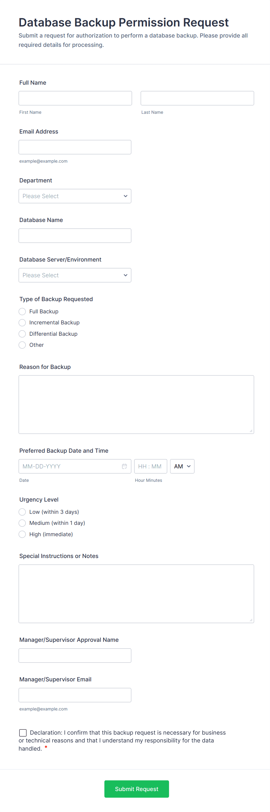 A server request form is a document that describes the server requirements and operating environment to be used for a software or hardware product. Easily embed this form either on your website or share it via URL. No coding.
