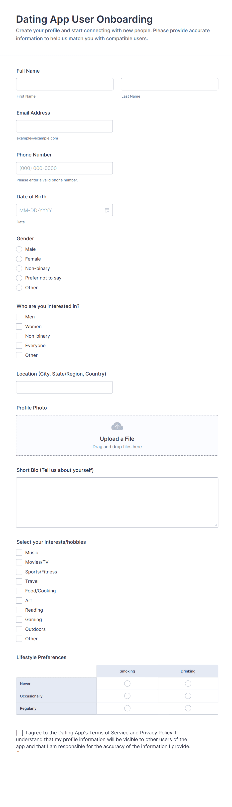Onboarding Form Templates are specialized digital forms designed to streamline the process of integrating new employees, clients, students, or members into an organization or program. These templates help collect essential information, set expectations, and ensure a smooth transition for newcomers. Common use cases include employee onboarding, client intake, volunteer registration, student enrollment, and vendor onboarding. By standardizing the onboarding process, these forms help organizations gather necessary data, provide important resources, and establish clear communication from the very beginning.