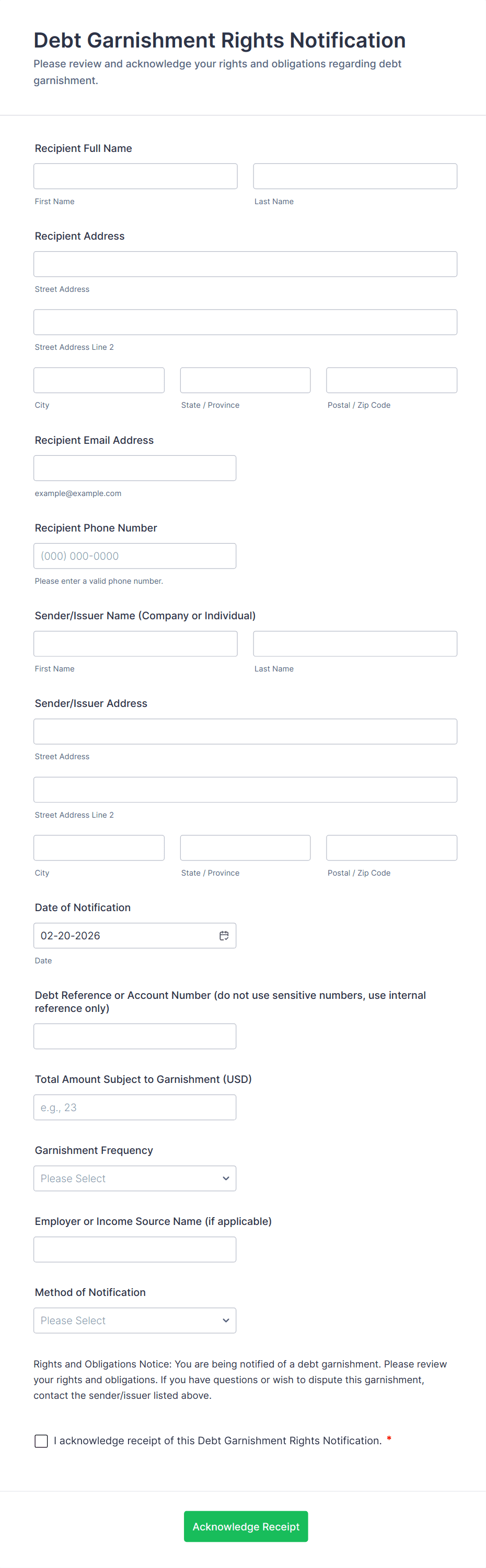 The form templates here are for informational purposes only. Jotform is not providing legal, financial, or other advice, or implying that the forms are legally valid in all or any jurisdictions. Before using any such form, consult an attorney and/or other applicable professionals to make sure that the form meets your needs, legally and otherwise.