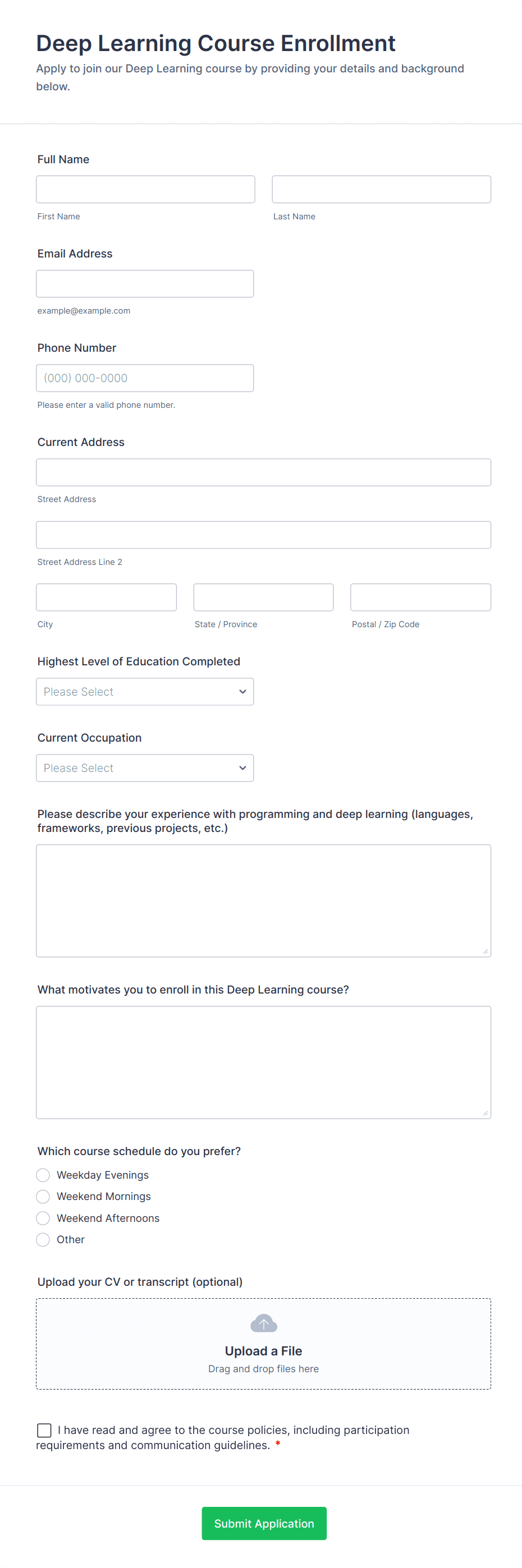 Course enrollment forms serve a wide variety of educational and training environments, each with unique requirements and challenges. Here’s how these forms can be adapted to different scenarios:
