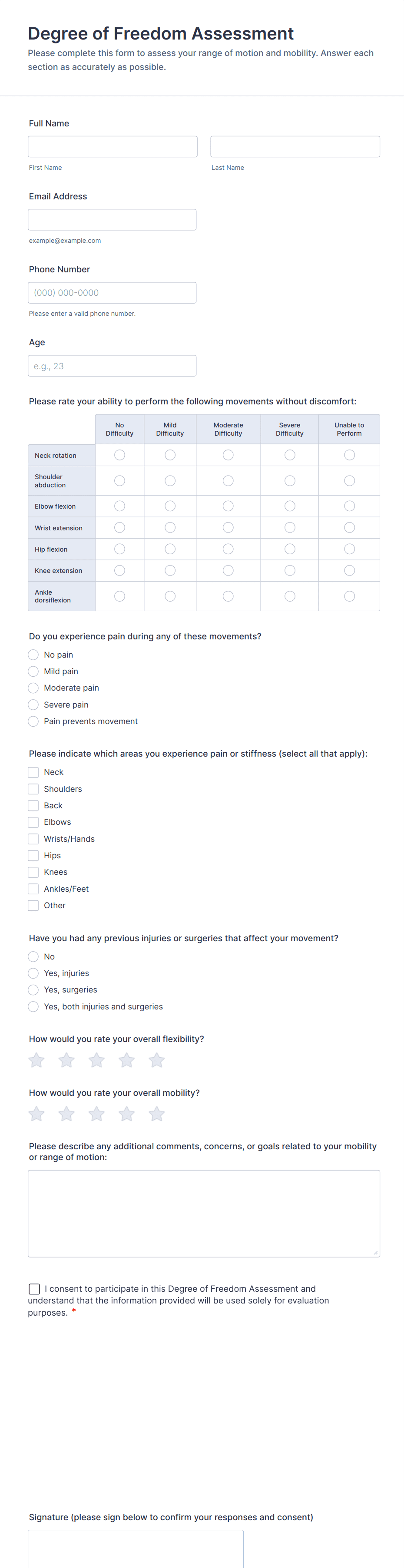 Healthcare assessment forms are structured documents used to collect and evaluate patient health information to support clinical decisions, care planning, and ongoing monitoring. They help healthcare teams capture consistent details about symptoms, medical history, risk factors, functional status, and care needs in a clear and organized way. Healthcare assessment forms are commonly used in clinics, hospitals, telehealth services, rehabilitation centers, home care, and specialty practices for intake assessments, screening evaluations, follow-up check-ins, and condition monitoring. By standardizing assessment workflows, these forms improve documentation quality, reduce missing information, and support safer, more coordinated care.
