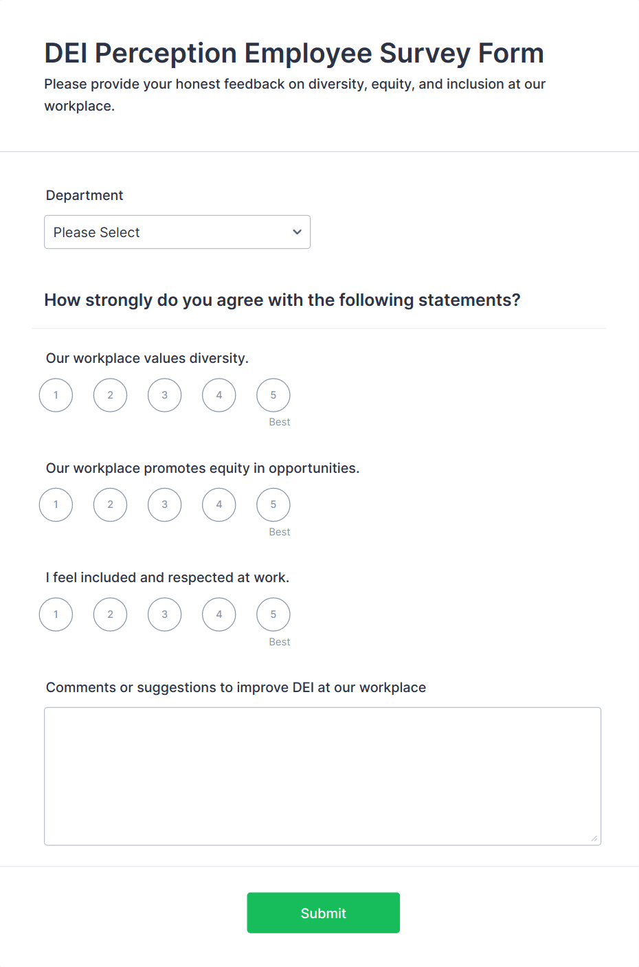 Employee Survey Templates are pre-designed forms that organizations use to gather feedback, opinions, and insights from their workforce. These templates cover a wide range of topics, including job satisfaction, workplace culture, employee engagement, training needs, performance evaluations, and more. By using employee survey templates, HR professionals, managers, and business owners can efficiently collect valuable data to understand employee sentiment, identify areas for improvement, and make informed decisions that enhance workplace productivity and morale. Common use cases include onboarding feedback, exit interviews, pulse surveys, annual engagement surveys, and 360-degree feedback.