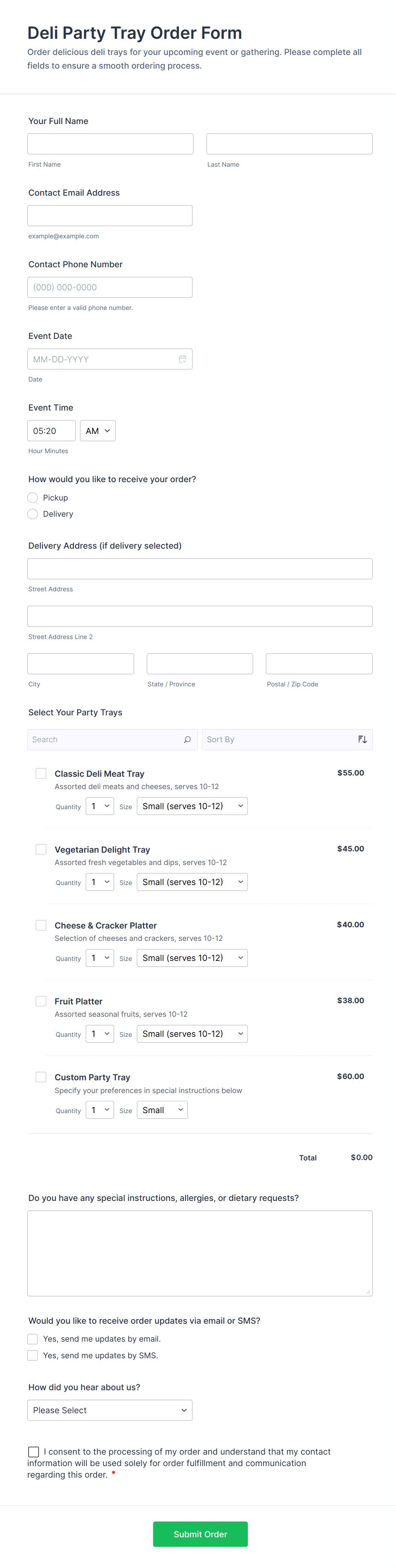 • Corporate Events: May require company details, billing information, delivery time, and multiple menu options.