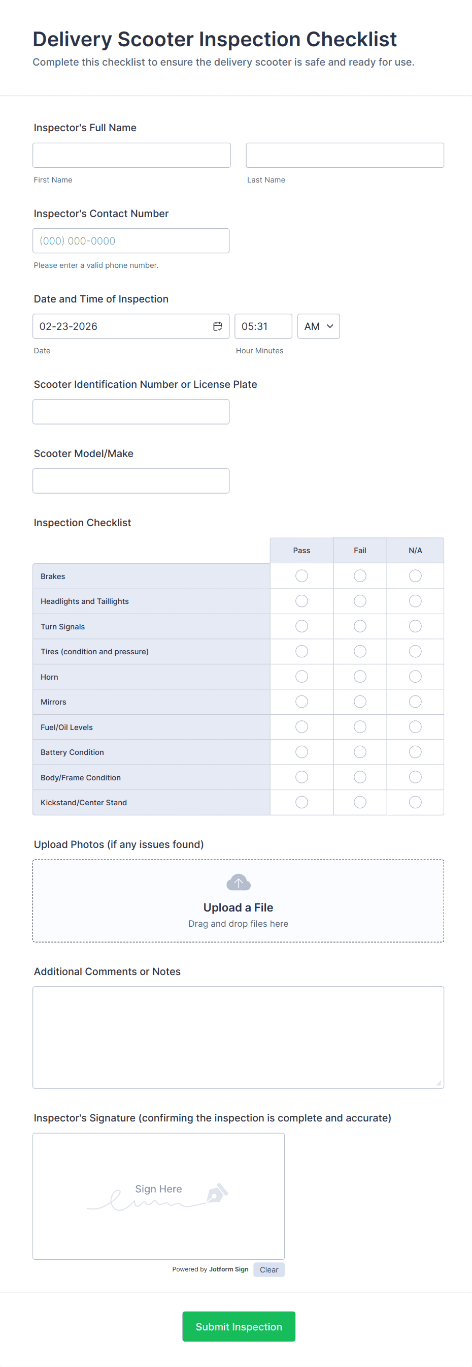 - Signature fields for inspector and/or vehicle owner
