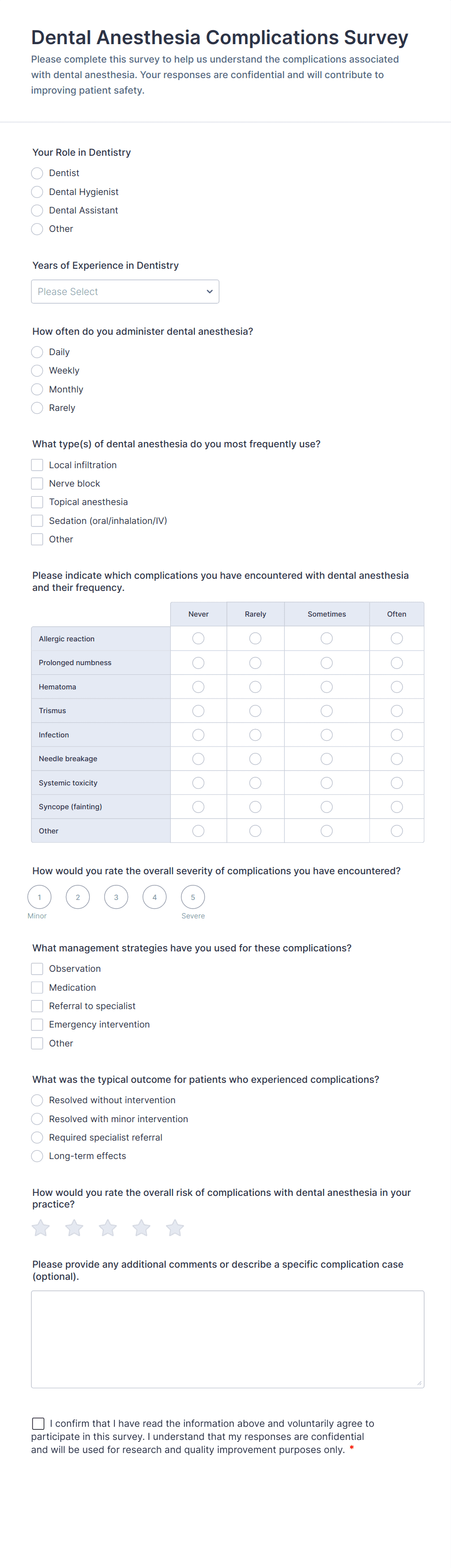 Healthcare surveys are specialized questionnaires designed to collect valuable information from patients, healthcare professionals, and other stakeholders within the medical field. These surveys can be used for a variety of purposes, such as assessing patient satisfaction, gathering feedback on healthcare services, monitoring public health trends, evaluating treatment outcomes, and conducting research studies. Healthcare organizations, clinics, hospitals, and research institutions rely on these surveys to improve patient care, streamline operations, and ensure compliance with industry standards.