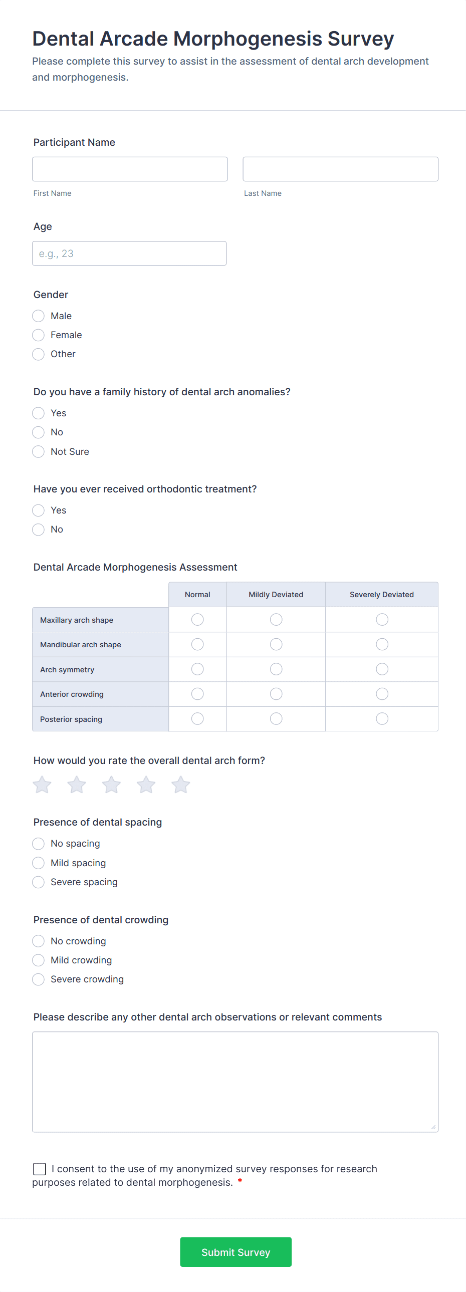• Research Questionnaires: Require consent forms, demographic data, and study-specific queries.
