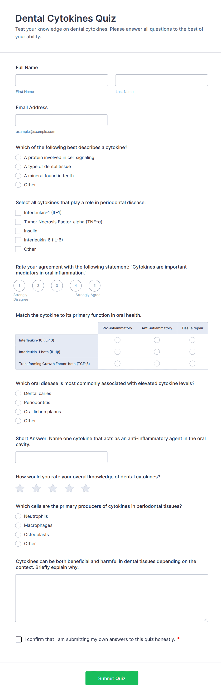 Quiz Templates are pre-designed forms specifically created to facilitate the process of building quizzes for a variety of purposes, such as education, employee training, lead generation, event engagement, and more. These templates provide a structured way to present questions, collect answers, and automatically score or evaluate responses. Whether you’re a teacher assessing student knowledge, a business running a product knowledge test, or a marketer creating a fun personality quiz, Quiz Templates offer a flexible foundation to suit your needs. They can be used for online exams, trivia games, onboarding assessments, customer feedback quizzes, and interactive learning modules.