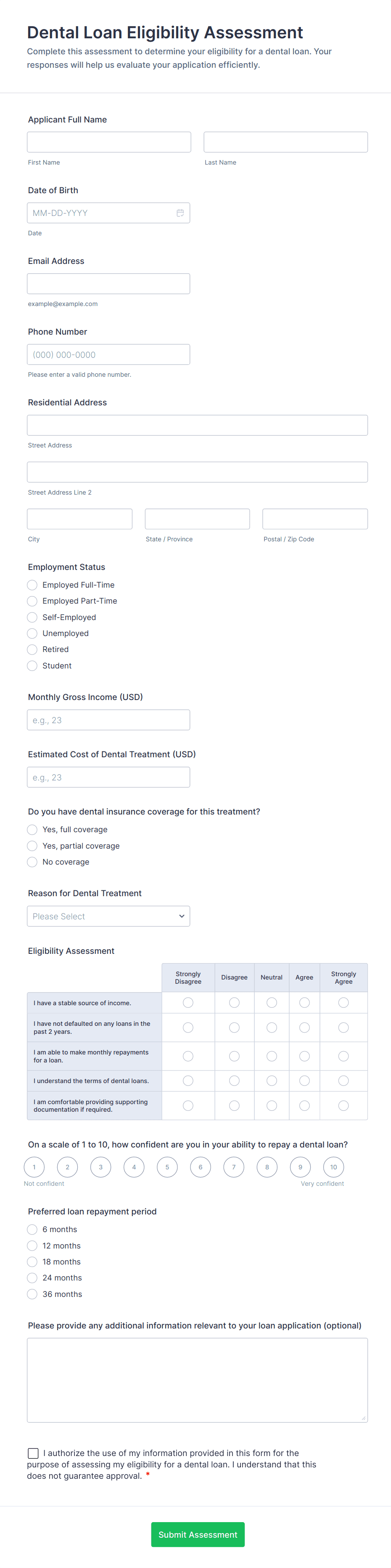 - File upload fields for supporting documents (e.g., pay stubs, tax returns, business plans)