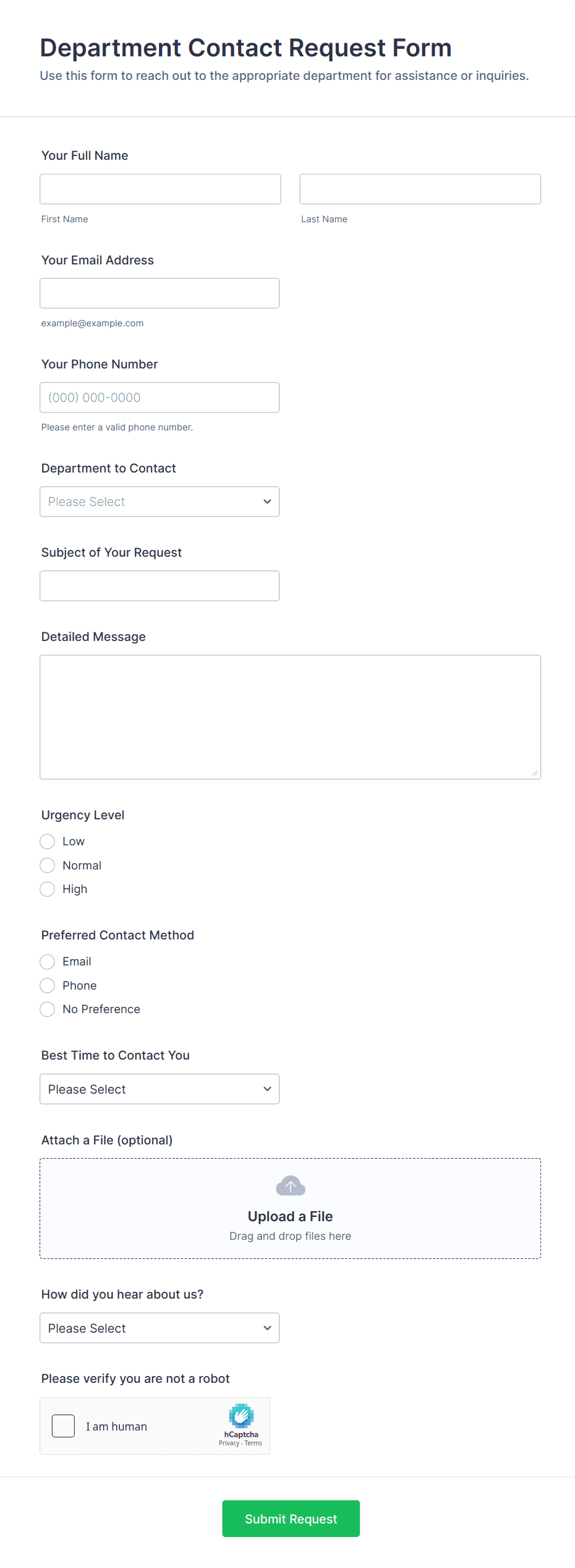 - For specialized use cases, include dropdowns (e.g., inquiry type), checkboxes (e.g., preferred contact method), or file upload fields (for attachments or screenshots).