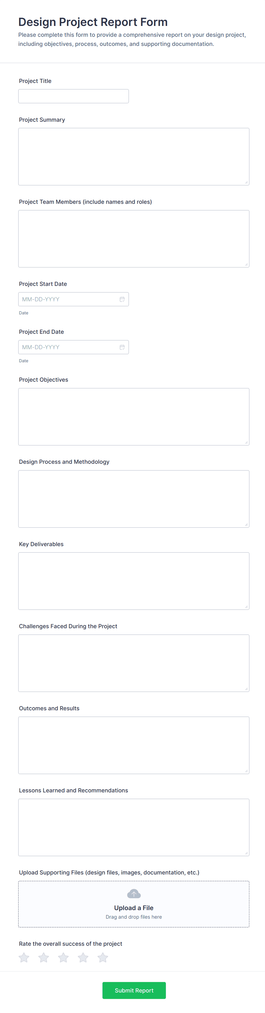 • For business reports: Include fields for dates, metrics, comments, and file uploads.