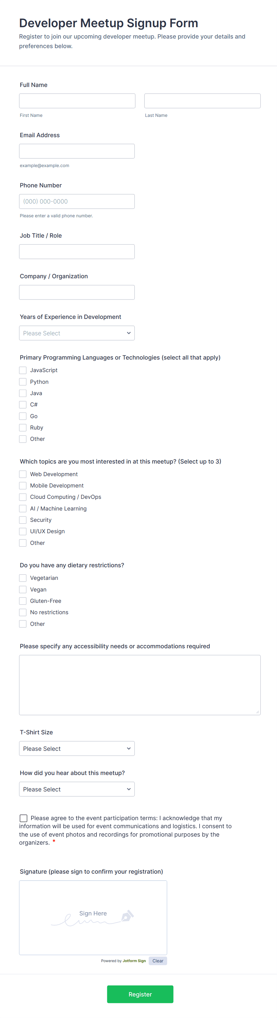 • Include event-specific fields like session selection, meal preferences, or T-shirt sizes.