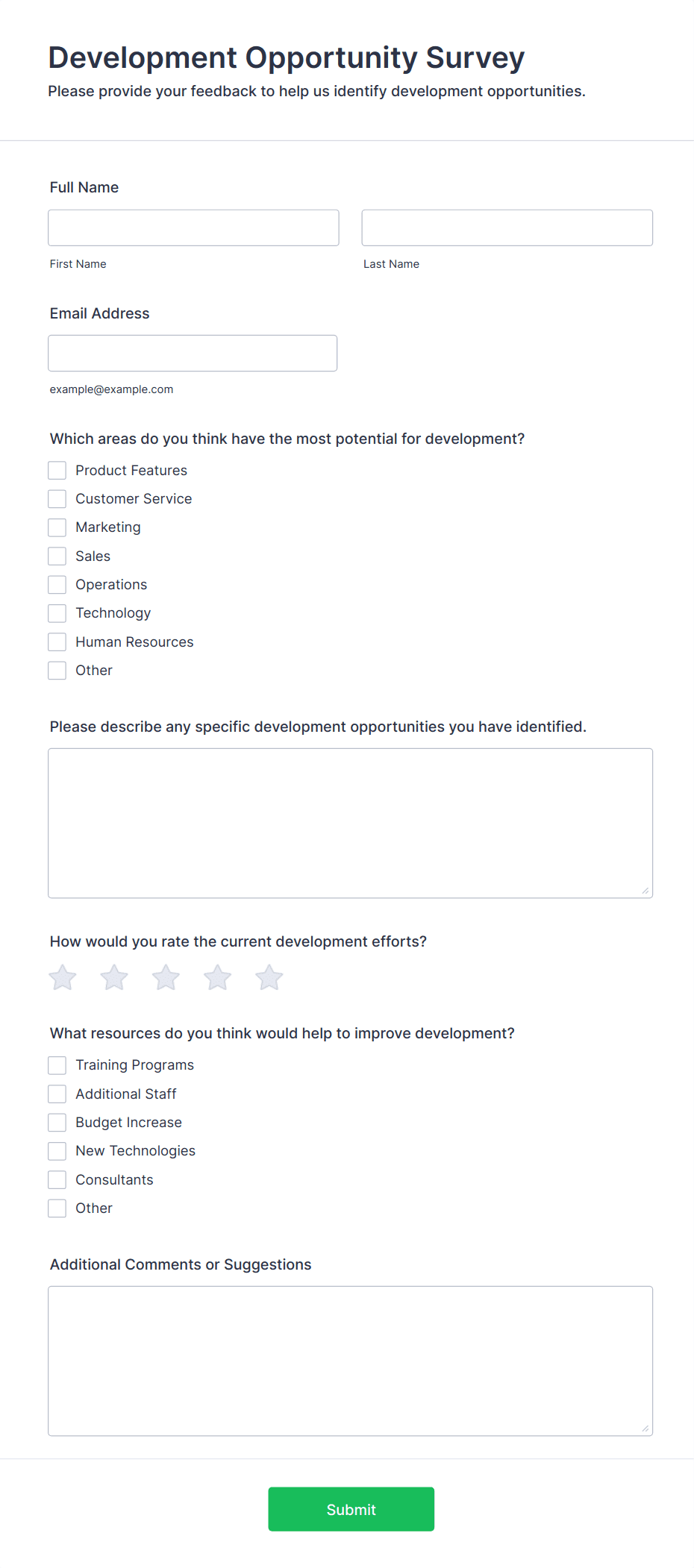 • For customer satisfaction surveys, include Net Promoter Score (NPS) fields or star ratings.