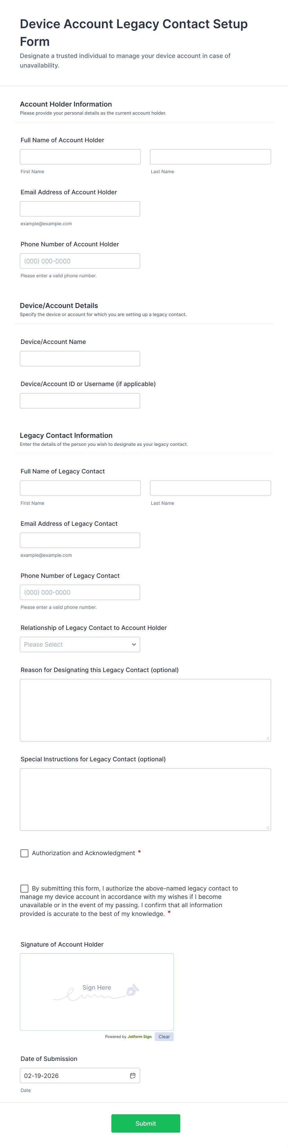 The form templates here are for informational purposes only. Jotform is not providing legal, financial, or other advice, or implying that the forms are legally valid in all or any jurisdictions. Before using any such form, consult an attorney and/or other applicable professionals to make sure that the form meets your needs, legally and otherwise.