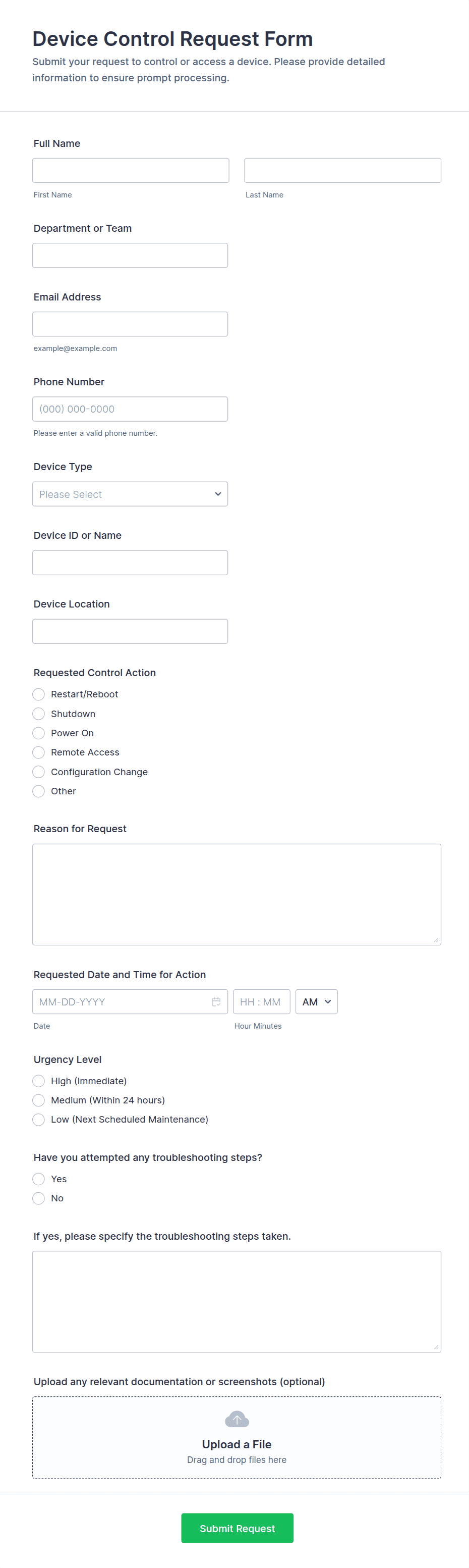 • Use conditional logic to show or hide fields based on the type of request selected. For example, if “Hardware Request” is chosen, display fields for device type and quantity; if “Technical Issue” is selected, show problem description and urgency.
