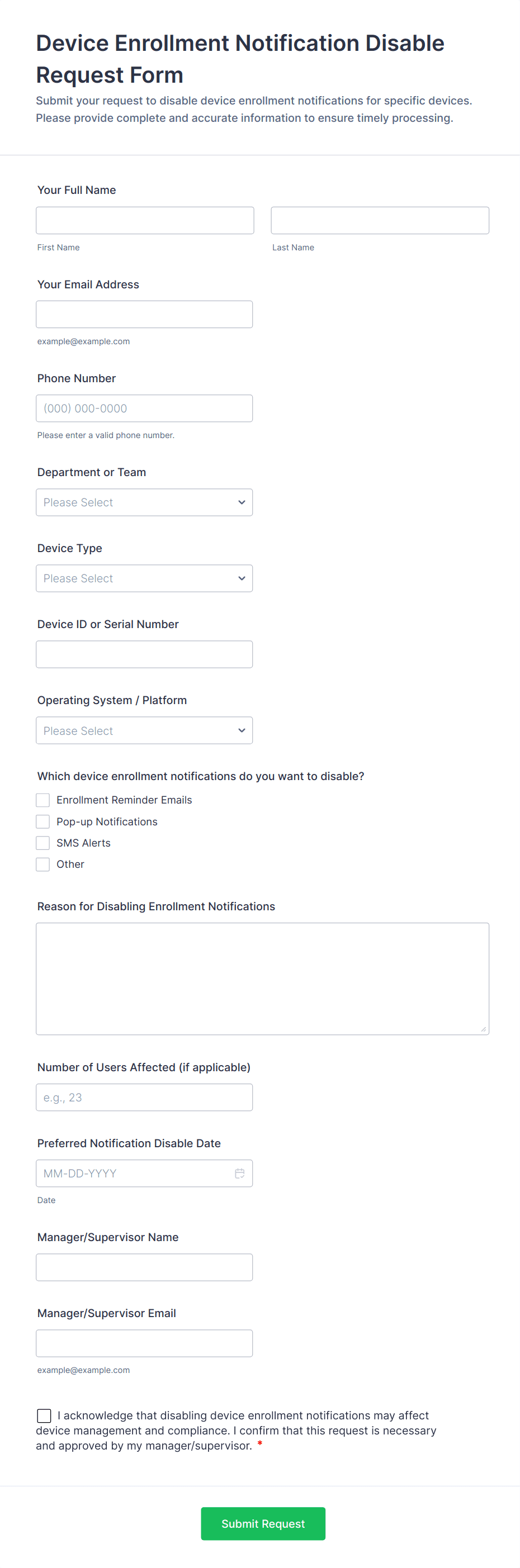 - Hardware Requests: Forms may include fields for device type, quantity, justification, and delivery location.