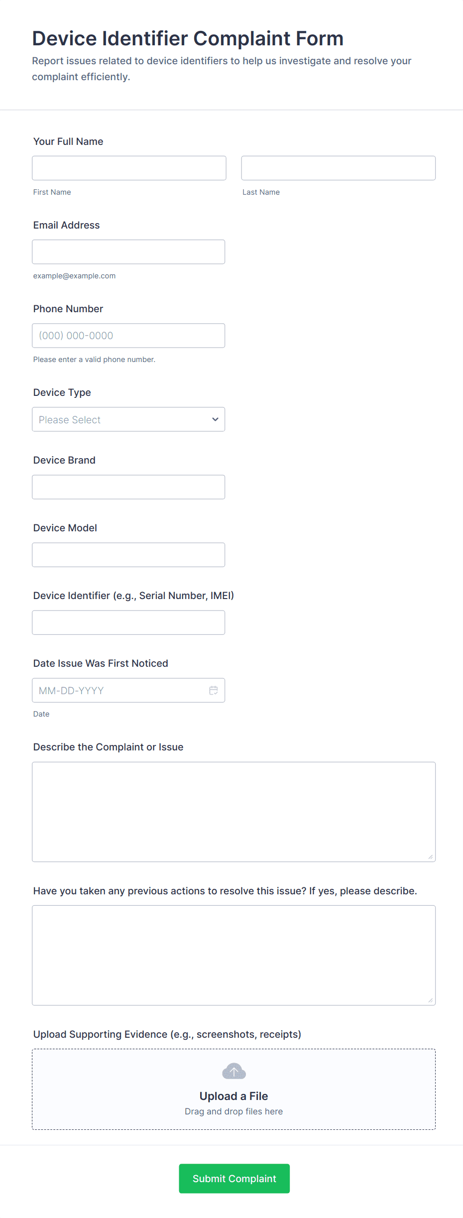 • Use conditional logic to show or hide fields based on user responses (e.g., display additional questions if the complaint is about a specific service).