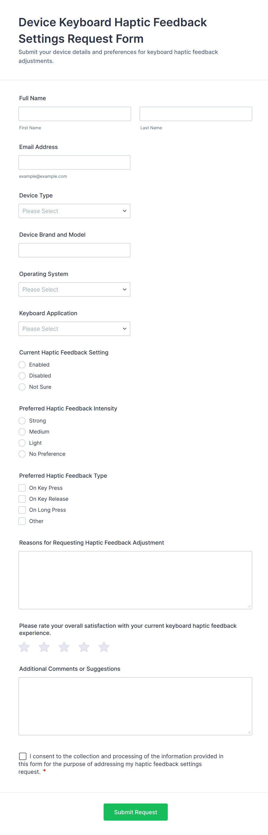 • Use conditional logic to show or hide fields based on the type of request selected. For example, if “Hardware Request” is chosen, display fields for device type and quantity; if “Technical Issue” is selected, show problem description and urgency.