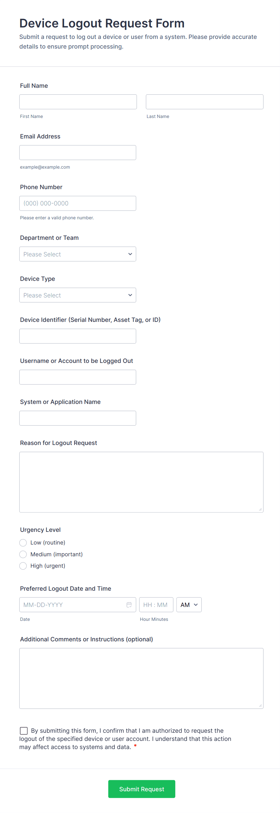 Access control forms are structured documents used to request, approve, and document access to physical locations, systems, or restricted resources. They help organizations manage who can enter certain areas, use specific equipment, or access sensitive digital systems by collecting consistent details such as requester identity, access level, justification, and approval records. Access control forms are commonly used in offices, campuses, data centers, hospitals, warehouses, and IT environments for badge requests, visitor access, temporary passes, role-based system access, and permission changes. By standardizing access requests, these forms reduce security risks, improve accountability, and create clear audit trails.