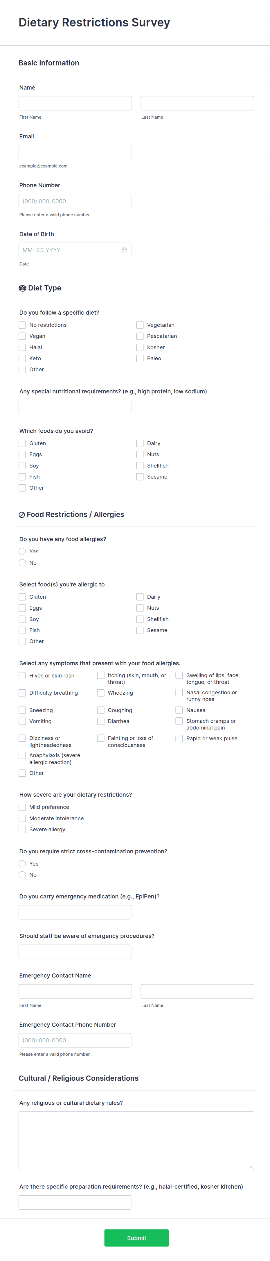 3. What information is typically collected in a dietitian form?