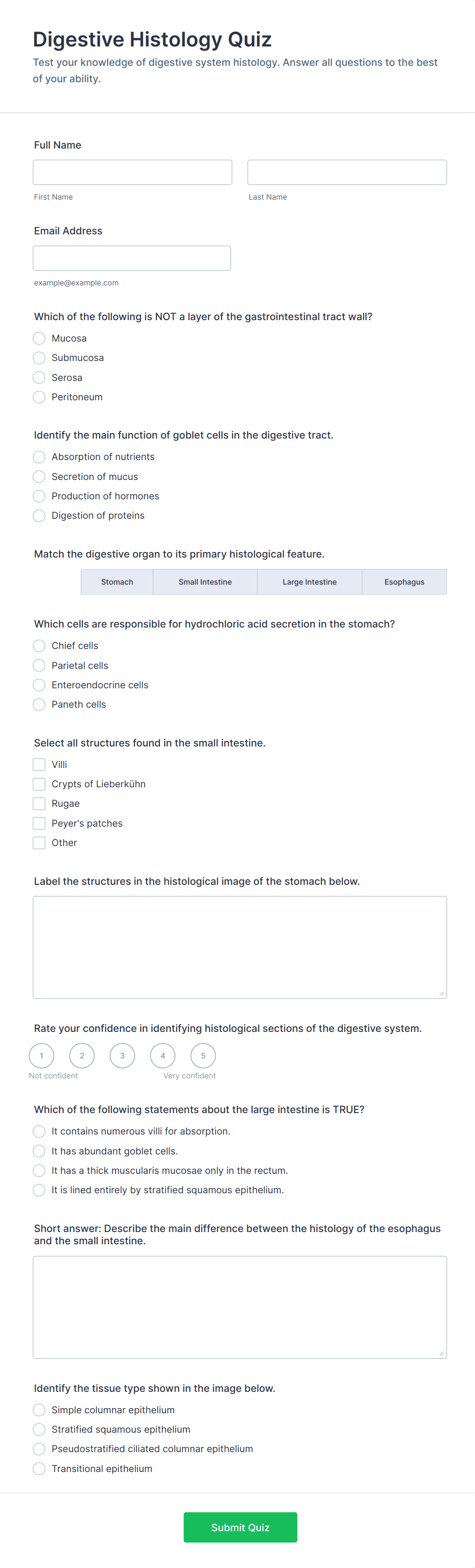 Quiz Templates are pre-designed forms specifically created to facilitate the process of building quizzes for a variety of purposes, such as education, employee training, lead generation, event engagement, and more. These templates provide a structured way to present questions, collect answers, and automatically score or evaluate responses. Whether you’re a teacher assessing student knowledge, a business running a product knowledge test, or a marketer creating a fun personality quiz, Quiz Templates offer a flexible foundation to suit your needs. They can be used for online exams, trivia games, onboarding assessments, customer feedback quizzes, and interactive learning modules.