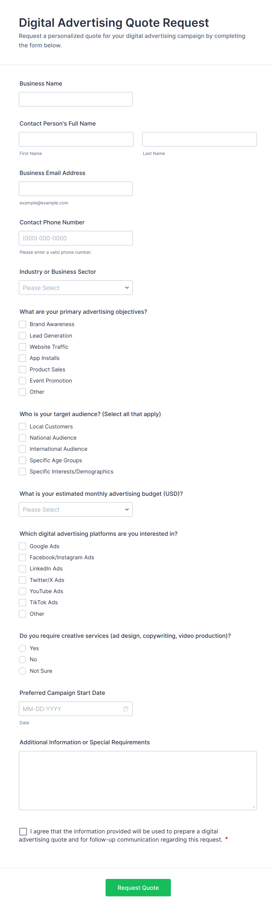- For service-based quotes, include fields for location, preferred dates, and specific requirements.