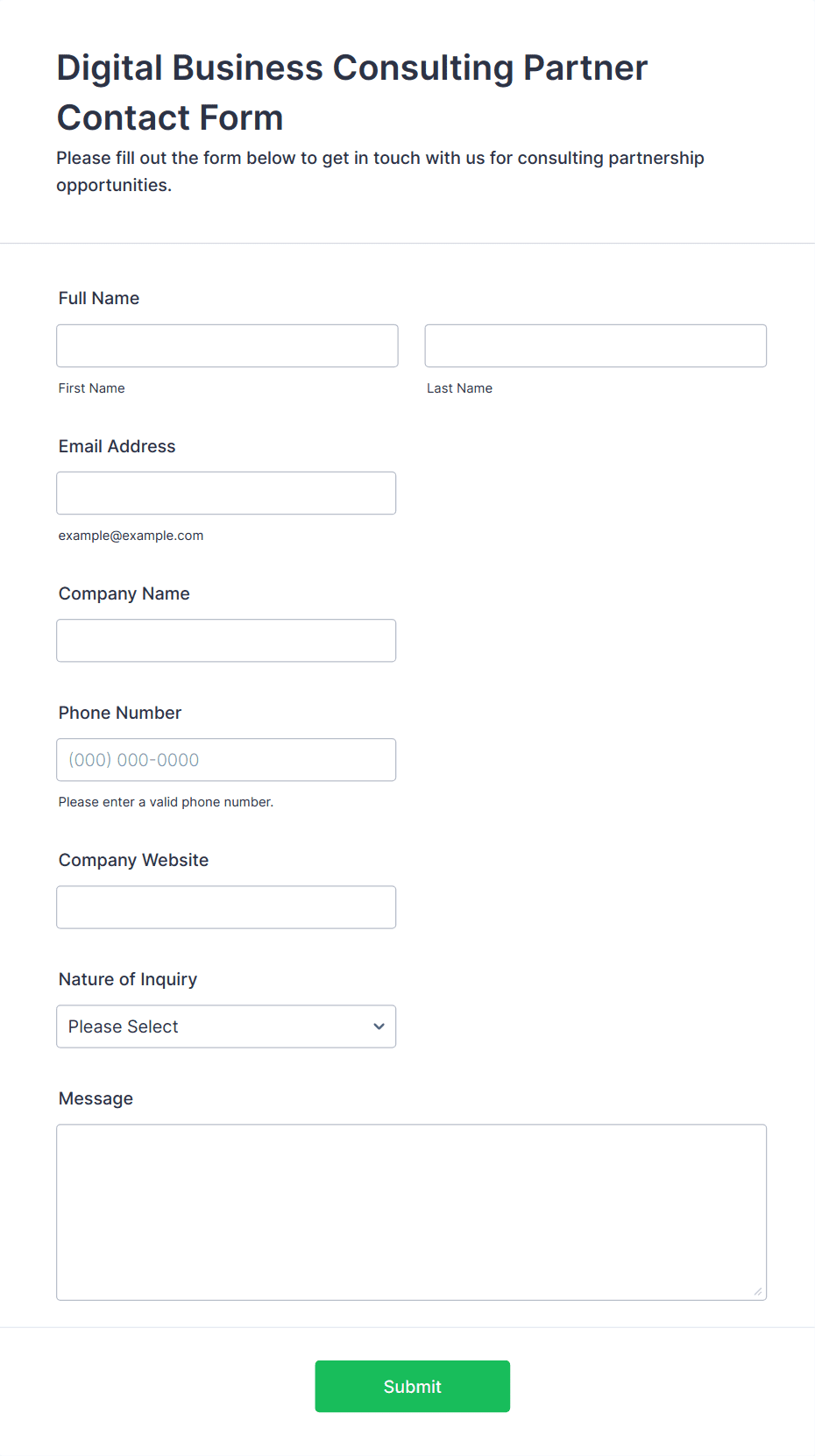 • Sales or quote request forms could ask for company details, budget, and specific service interests.