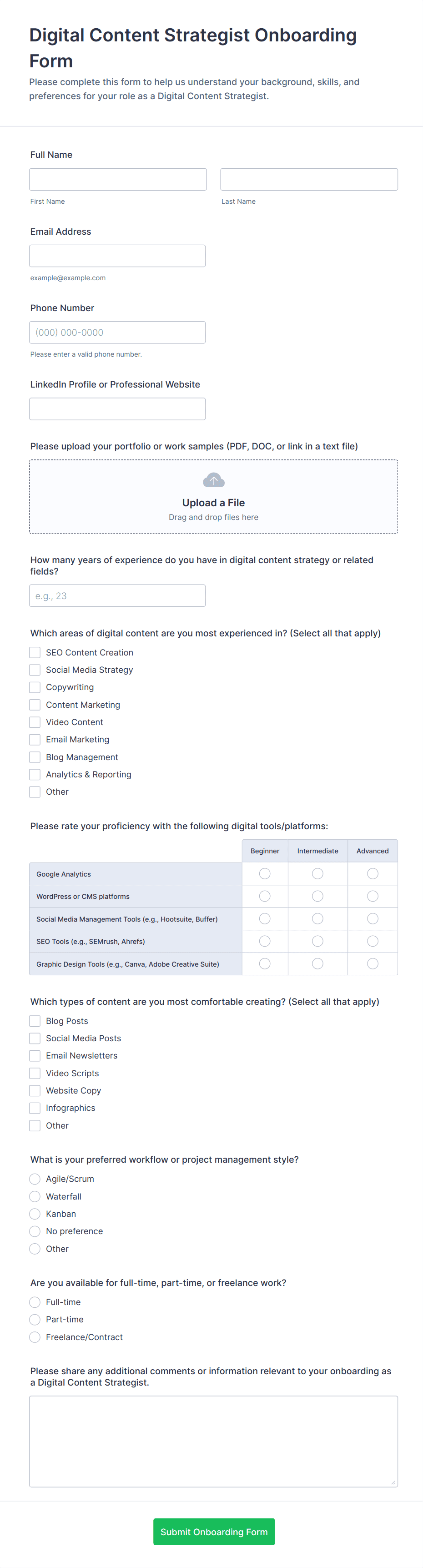 An onboarding form template is a pre-designed digital form used to collect essential information from new employees, clients, students, or partners during the onboarding process.