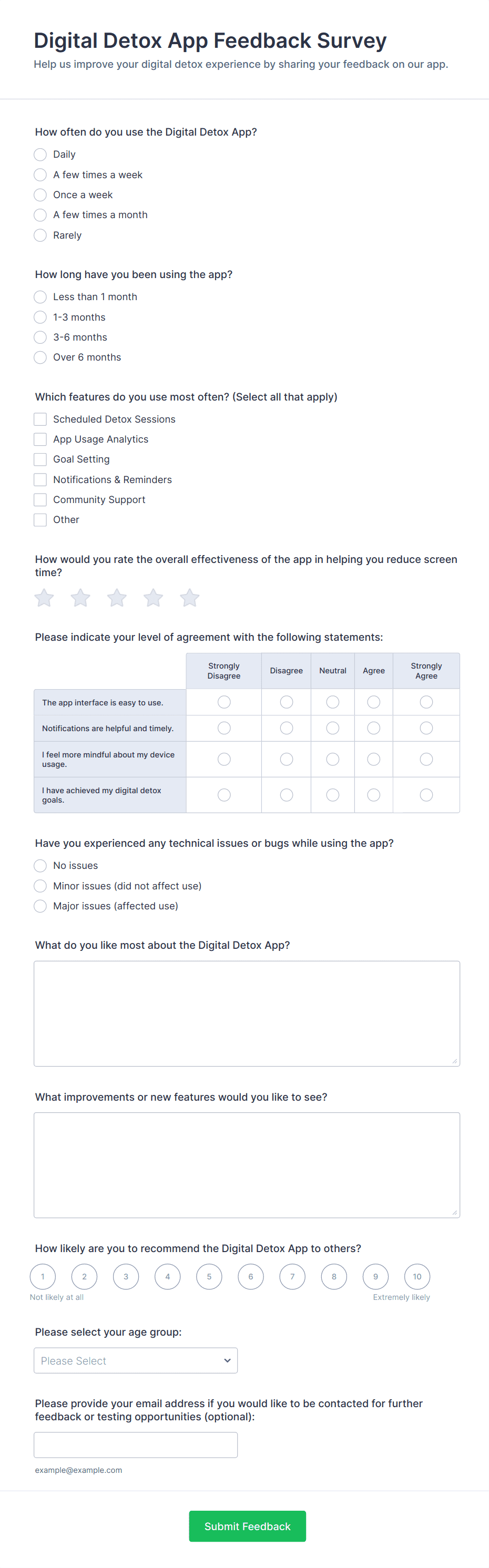 - Multiple choice and rating scales for satisfaction or feature evaluation.