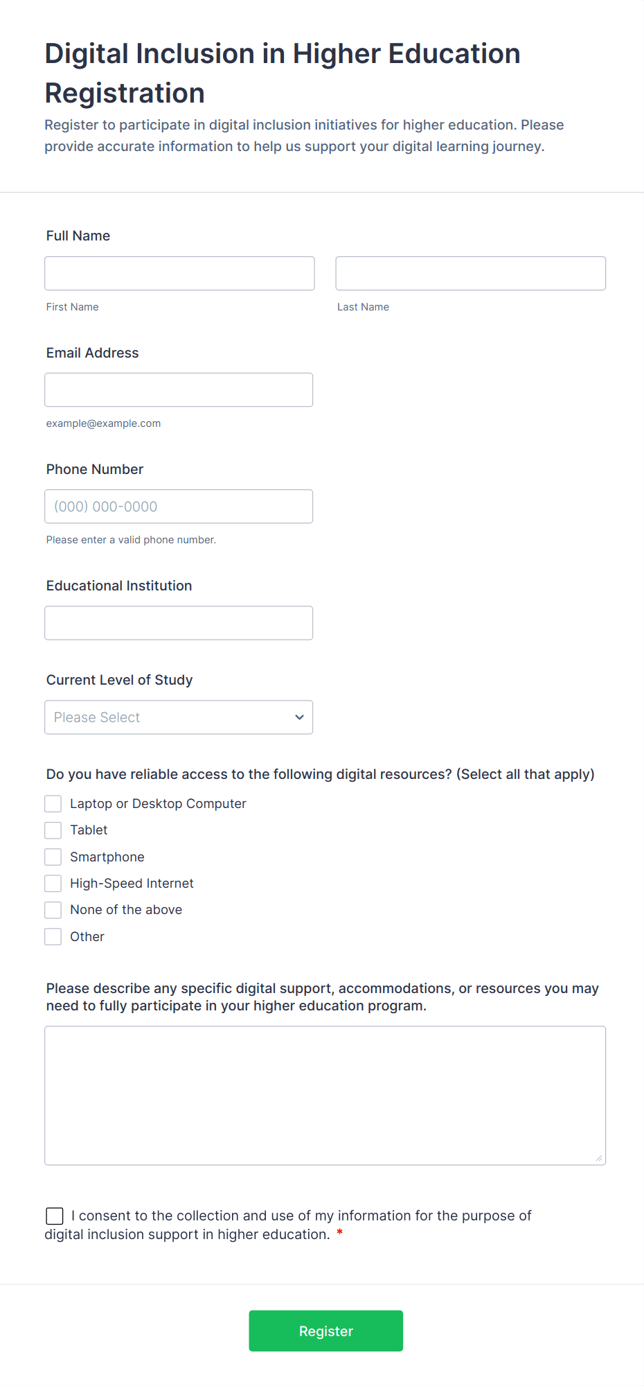 The Education Training Registration Form helps educational institutions and training providers collect participant registrations efficiently, ensuring a smooth enrollment process for courses and workshops.